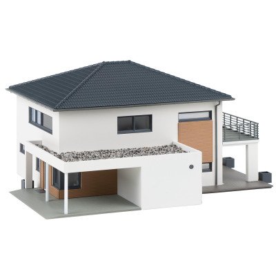 Bouwpakket WeberHaus "Citylife". Model van een twee verdiepingen tellend herenhuis met balkon en schilddak uit de serie "CityLife" van de Baden-Württembergse fabrikant van prefabwoningen "WeberHaus". Houten elementen en de moderne grijstint van de raamkozijnen breken visueel de witte gevel. Het overdekte terras is toegankelijk via grote schuifdeuren. Een plat dak overspant de voordeur en carport.
