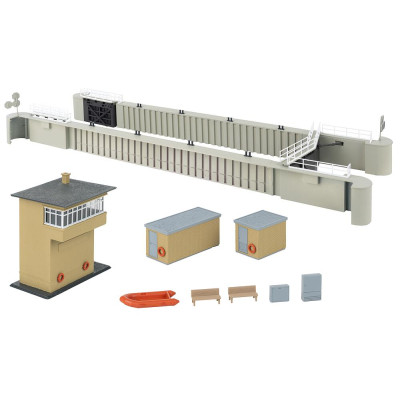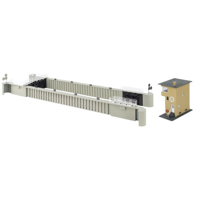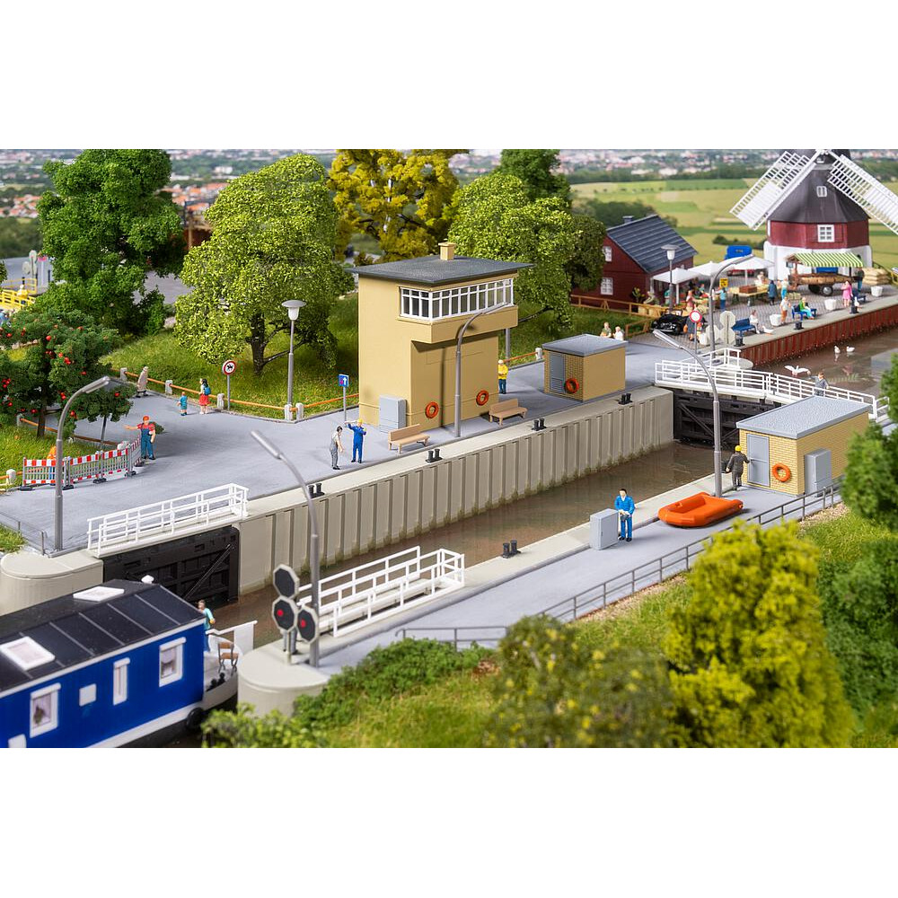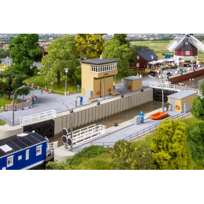 Met het schip naar een hoger niveau. Model van een sluis met bijbehorend bedieningsgebouw. De sluis bevat 2 deuren waardoor schepen naar binnen en buiten kunnen varen. De sluis heeft en sluiskamer met geprofileerde wanden. De deuren zitten in stevige betonnen funderingen. Het bedieningsgebouw is uitgevoerd in wit pleisterwerk en voorzien van een plat dak. Het complex is verder gedetailleerd met bolders op de sluiskamer en voor de veiligheid van de passanten voorzien van reddingsboeien.