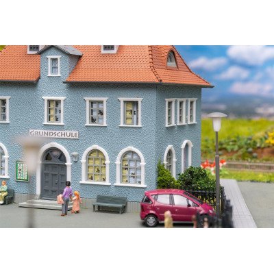Deze actieset bevat een charmant basisschoolgebouw in een vriendelijke lichtblauwe kleur. Het kondigt de eerste schooldag aan met zijn speele torentje op het rode pannendak. Een grote boogdeur laat de leerlingen binnen en door de witte ramen kunnen ze het schoolplein gadeslaan. Daar zorgen verschillende speeltoestellen voor plezier en beweging. Scghommels, klimrekken en een zandbak nodigen de kinderen uit om te spelen. Een voetbalgoal wacht op de volgende wedstrijd en een draaimolen draait rondjes. De set bevat ook 8 miniatuurschoolkinderen om het decor te verlevendigen.