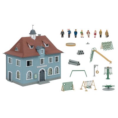 Inhoud: Schoolgebouw, 8 bijpassende figuren, speeltoestellen voor het schoolplein (schommels, glijbaan, klimrekken, draaimolen, zandbak, klimtoestel, voetbaldoel).
