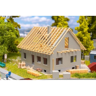Bouwen, timmeren en werk in uitvoering! Twee huizen rijzen op uit de grond. Het ene met een vers begonnen dakstructuur, het andere nog in de ruwbouw. Een grote silo, een blauwe bouwwagen en een heleboel accessoires brengen echte bouwflair naar de miniatuurwereld. Ook inbegrepen: hardwerkende bouwvakkers die boren, schroeven en de set tot leven brengen!