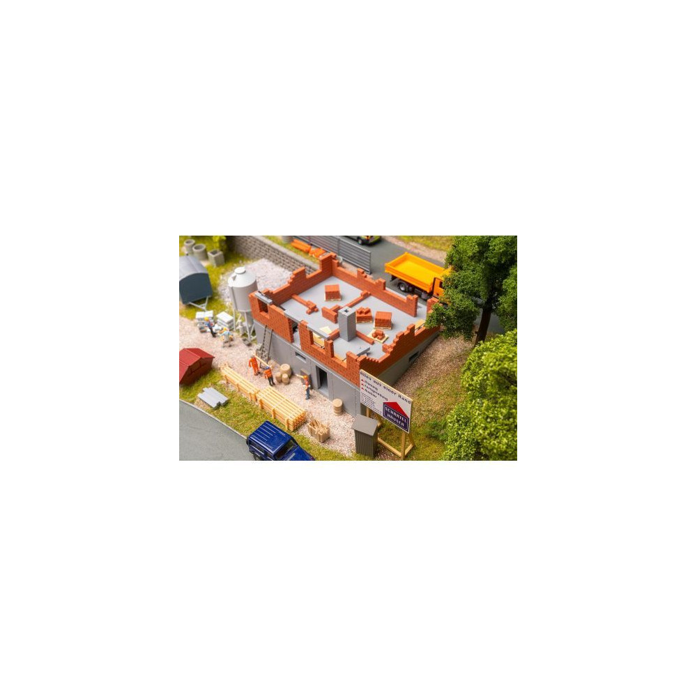 Inhoud: Vrijstaand huis in aanbouw, huis in aanbouw, silo, bouwwagen, 6 figuren, toiletblok, container, bouwplaatsbord, andere accessoires (kruiwagens, buizen, stenen, zakken, ladders, gereedschap, enz.)