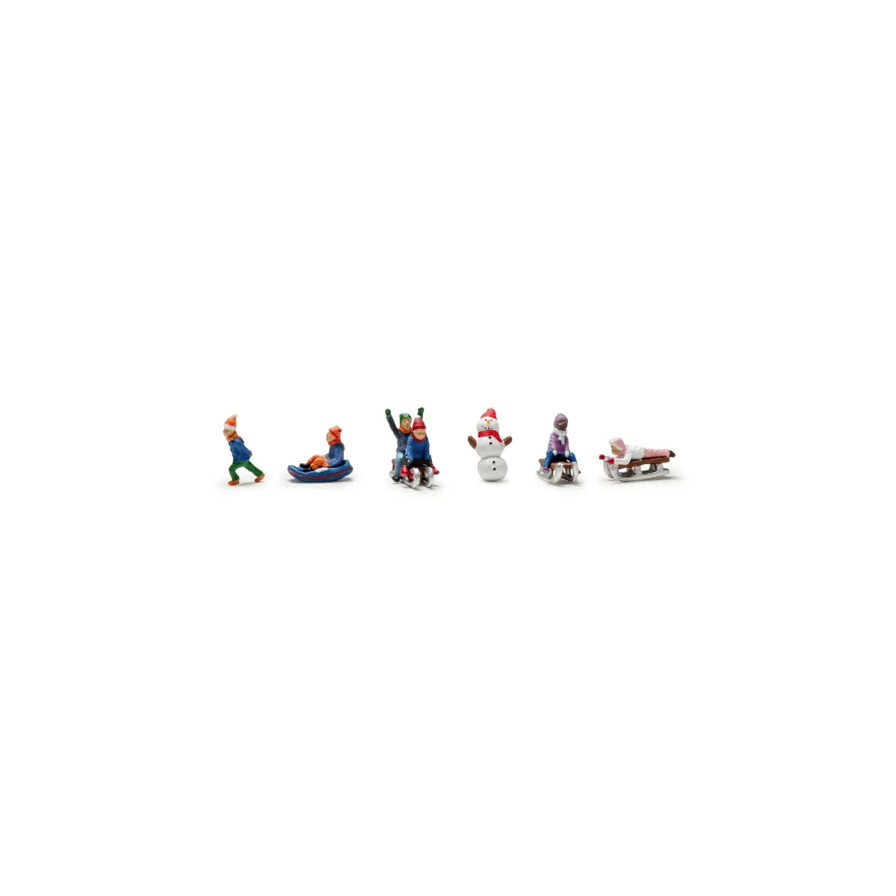 Deze set van kinderen op de slee bevat 6 kinderen en een sneeuwpop. De set is ideaal voor het decoreren van modelbanen en diorama's met een winterthema.