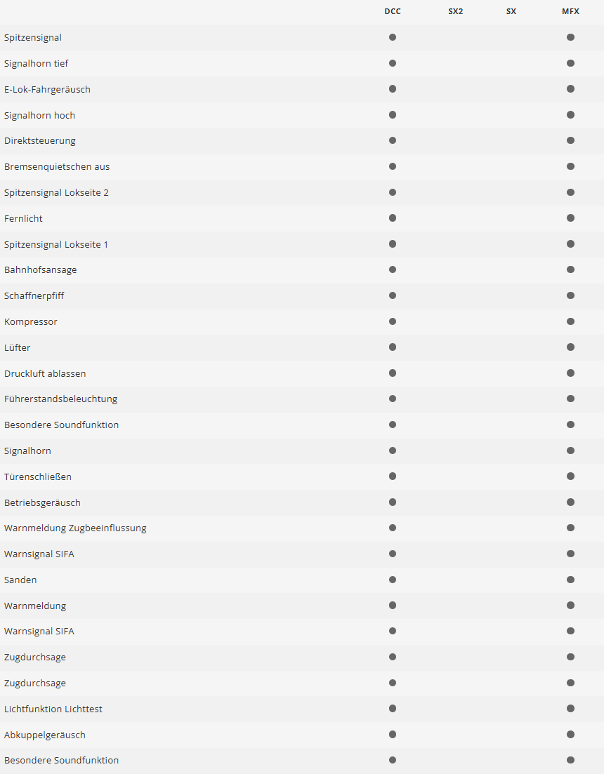Ingebouwde digitale decoder en geluidsgenerator voor gebruik met mfx en DCC. Motor met vliegwiel, 4 assen aangedreven, antislipbanden. Rijrichtingsafhankelijk wisselend drievoudig koplicht en 2 rode achterlichten conventioneel in bedrijf, digitaal schakelbaar. Koplicht aan loczijde 2 en 1 afzonderlijk digitaal uitschakelbaar. Als de koplamp aan beide zijden van de locomotief is uitgeschakeld, functioneert aan beide zijden de dubbele A-lamp. Verlichting voor de bestuurderscabine digitaal schakelbaar. Verlichting met onderhoudsvrije warmwitte en rode lichtdioden (LED). Aansluitbare remslangen worden apart meegeleverd.