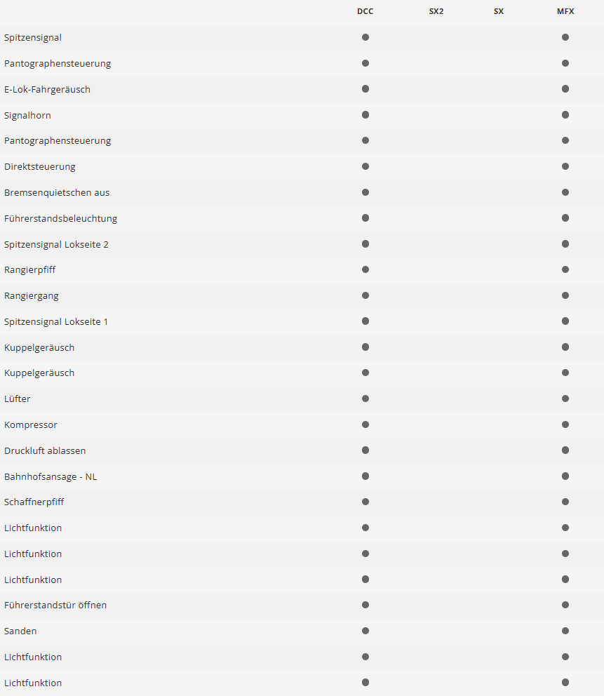 Met digitale DCC en mfx-decoder en uitgebreide geluidsfuncties. Geregelde krachtige aandrijving met centraal ingebouwde vliegwielmassa. Alle vier de assen aangedreven door cardanassen. Tractiebanden. Driepuntsfrontsein wisselt met de rijrichting en twee rode sluitseinen traditioneel in bedrijf, digitaal schakelbaar. Frontsein aan loczijde 2 en 1 afzonderlijk digitaal schakelbaar. Andere lichtfuncties zoals diverse rangeerlichten en gevarenseinen kunnen afzonderlijk worden bediend. De cabineverlichting kan digitaal worden bediend. Voor de verlichting worden onderhoudsvrije gele en rode LED's gebruikt. Pantografen kunnen digitaal omhoog en omlaag worden gebracht. Afzonderlijk aangebrachte ruitenwissers, ventilatorrooster, handrails en daklijnen. Bufferhoogte volgens NEM. Remleidingen en imitaties van een automatische koppeling worden als afzonderlijk te bevestigen onderdelen meegeleverd. Lengte over buffers ca. 20,3 cm.