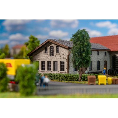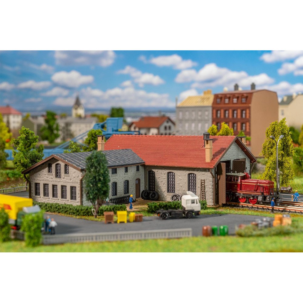 Deze locomotiefloods met twee stallingen biedt plaats aan twee locomotieven en wordt geleverd met veel accessoires om de omgeving authentiek te maken. De robuuste stenen gevel geeft het model een rustieke charme, die perfect wordt afgerond door het rode pannendak. Een echte verrijking voor elke N modelspoorbaan. Geschikt voor locomotieven met een engte over puffers tot 140 mm.