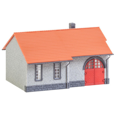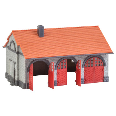 De massieve brandweerkazerne biedt plaats aan hulpverleningsvoertuigen en apparatuur en kan ook worden gebruikt als werkplaats. In schril contrast met de natuurstenen gevel staan drie rode klapdeuren met ronde bogen. Een extra deur aan de achterzijde van het gebouw maakt ook doorgang mogelijk.