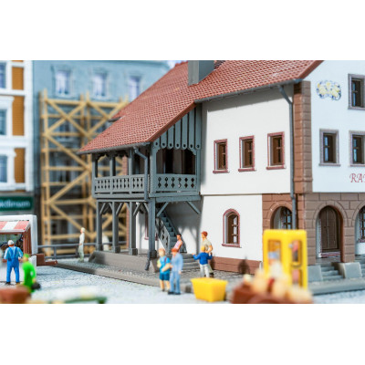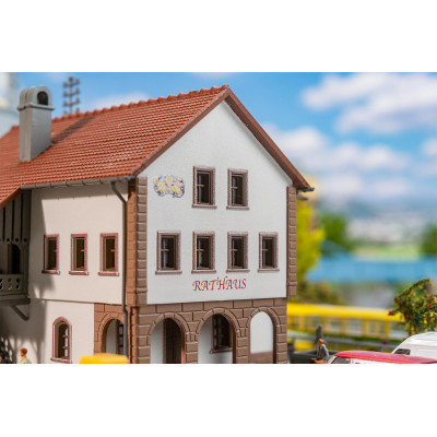 Het drie verdiepingen tellende kleine stadhuis met zijn opvallende derde gevel, de uitnodigende arcade en het zijbalkon met toegangstrap is een echte blikvanger op de modelbaan! De bouwset bevat ook een gedetailleerde grondplaat met en een schilderachtige fontein. Zo creëer je heel eenvoudig een charmant dorpsbeeld!
