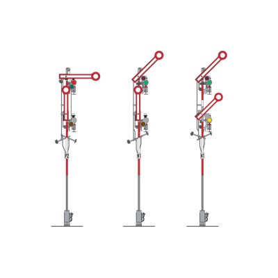 Uitvoeringssein met smalle mast met 2 niet-gekoppelde armen en opengewerkte smalle mast. Wisselt van rood naar groen of van rood naar groen/geel.