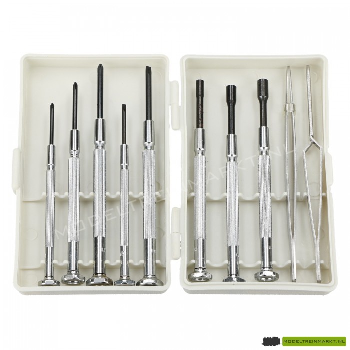 Omschrijving: Gereedschapsset, geschikt voor het onderhoud van H0- en Z-modellen.