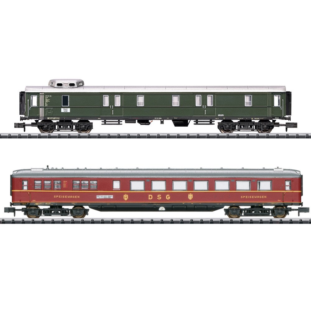Set sneltreinrijtuigen bestaande uit een WR4ü sneltrein restauratierijtuig en een Pw4ü-37 sneltrein bagagewagen (wegnummer 105 817) op de Deutsche Bundesbahn (DB) rond 1952. Treinroute: Hamburg - Keulen.