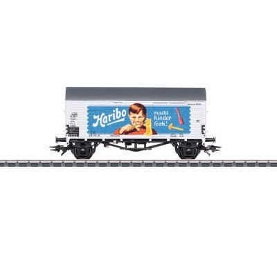 Gesloten goederenwagen Gms 30, voorheen Ghs “Oppeln”. Korte uitvoering, zonder handrem, remmersplatform en zonder remmershuisje. Privéwagen van de firma Haribo GmbH & Co. KG, Bonn. Ingezet bij de Deutsche Bundesbahn (DB). Met reclamemotief. Bedrijfstoestand rond 1962.