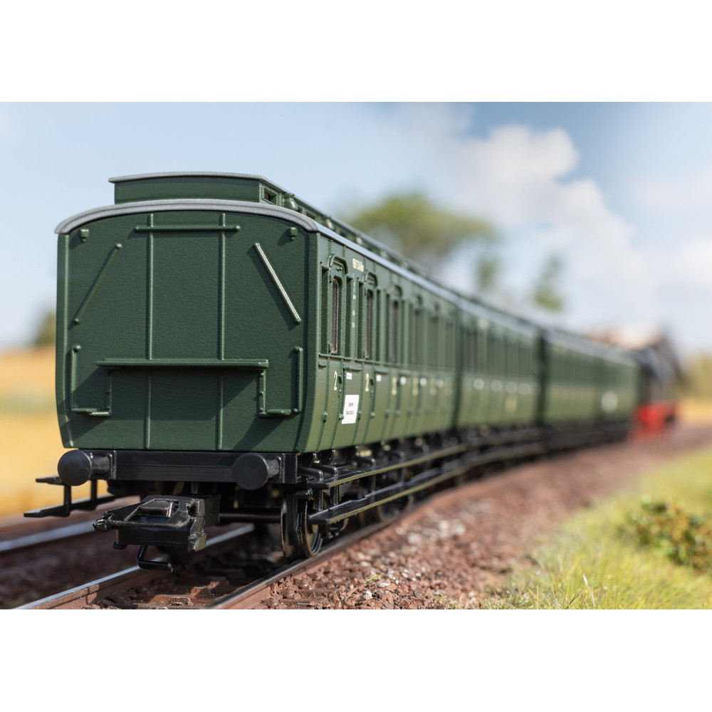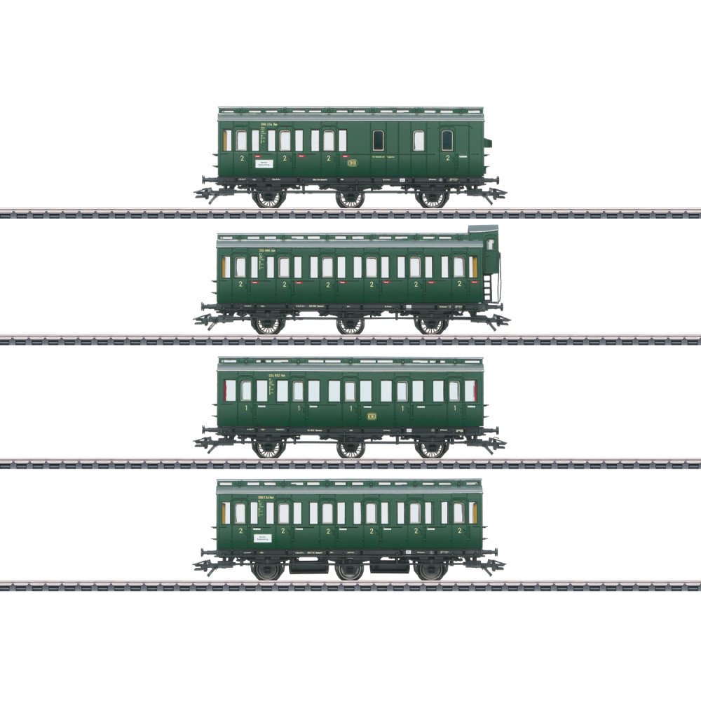 Vier verschillende types Pruisische drieassige coupérijtuigen van de Deutsche Bundesbahn (DB). Een coupérijtuig 2e klas met bagageruimtecoupé B3tr, een coupérijtuig 1e klas A3 en twee coupérijtuigen 2e klas B3. Glasgroene kleurstelling. Met thuisstation Hannover. Zoals in gebruik rond 1956.