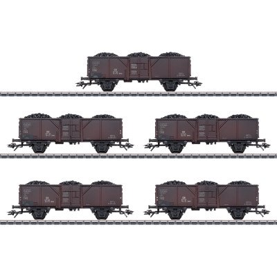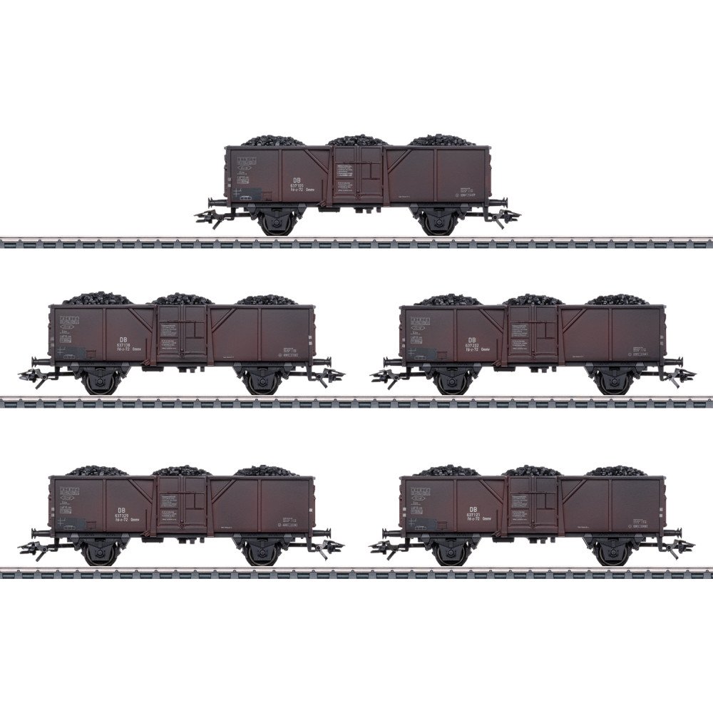 Midden-zelflossers type Fd-z-72 Ommv (Later El-u 061). Vijf midden-zelflossende wagens met lading steenkool en voorbeeldgetrouwe verouderingssporen zoals ze in de jaren '50 en '60 van de vorige eeuw vaak in het regionale goederenverkeer te zien waren. Het voordeel van deze wagens was dat ze snel en goedkoop bij lokale verkopers gelost konden worden.
