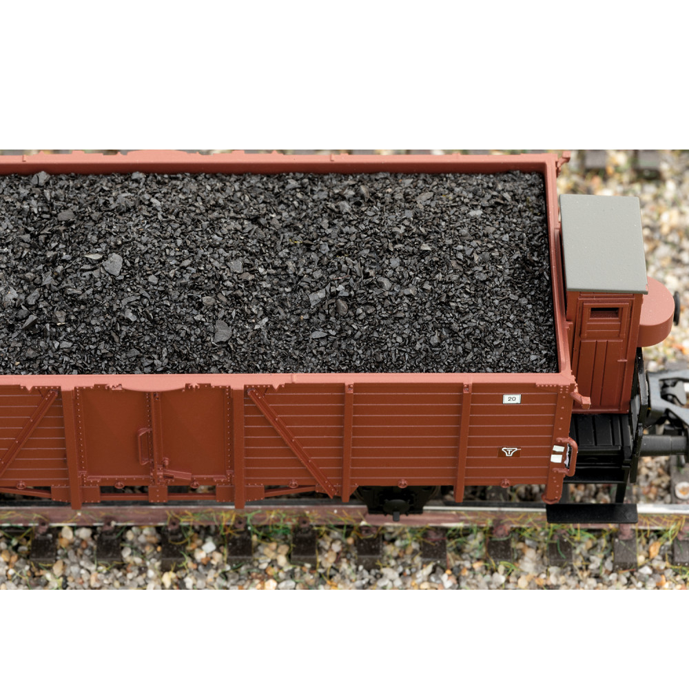 De twee open goederenwagens Om Königsberg en O Neurenberg met lading echte kolen in op schaal uitgevoerde grootte. Het paar draaischamelwagens is beladen met boomstammen van echt hout. Alle wagens afzonderlijk verpakt met extra omverpakking.