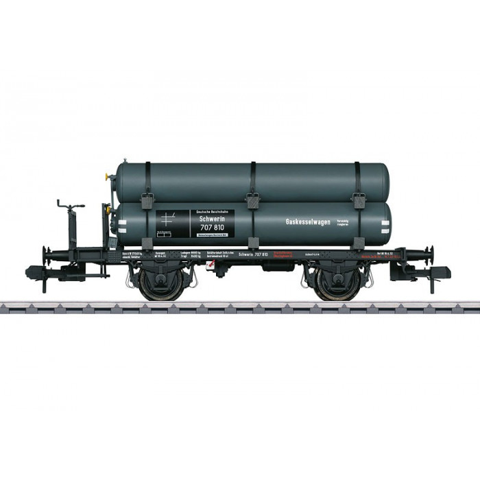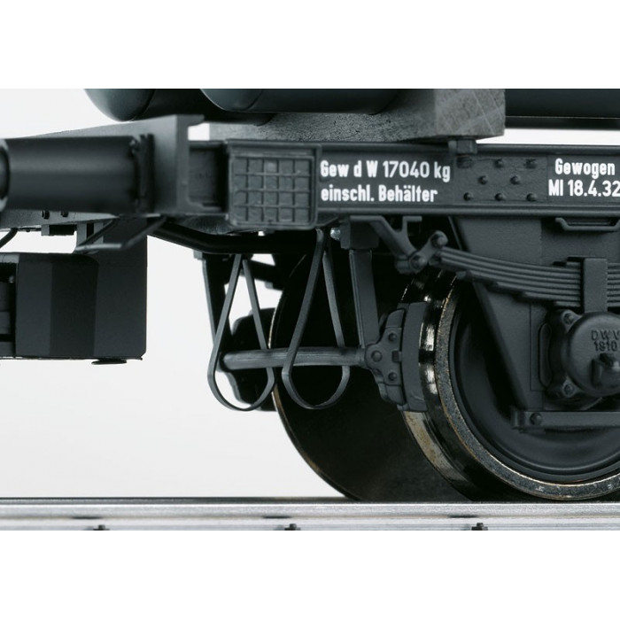 Omschrijving: Gas-ketelwagen met 2 houders als stapelopbouw. Dienstwagen van de Deutsche Reichsbahn Gesellschaft (DRG). Gascontainer met aanbouwdelen van metaal, met echte vierkante houten balken voorbeeldgetrouw met de lading verbonden. Containerwagen met remplatform. Model met verregaand herzien onderstel, voorzien van extra remdelen. Meegeleverde schroefkoppelingen en remslangen. Lengte over de buffers 27,5 cm.
